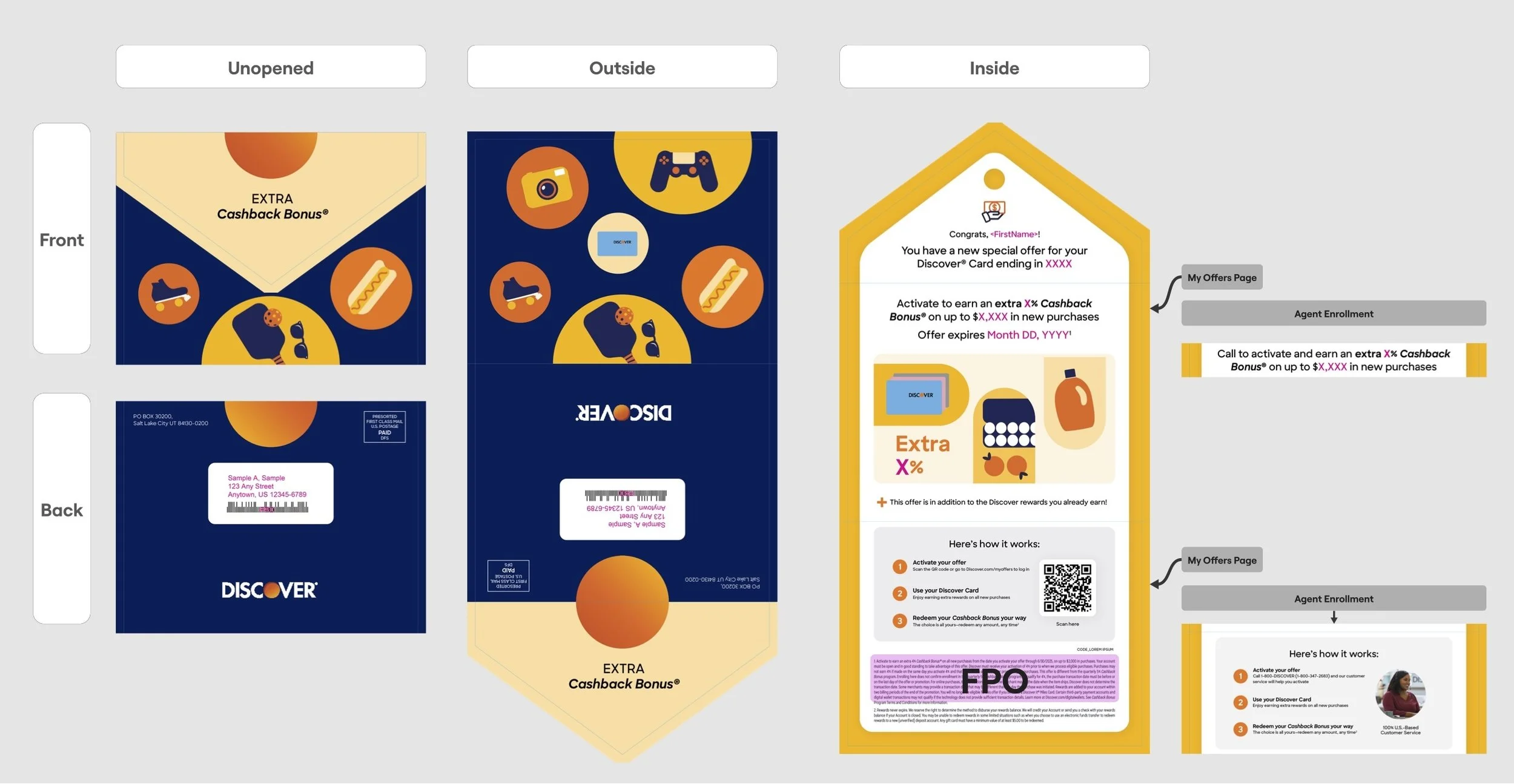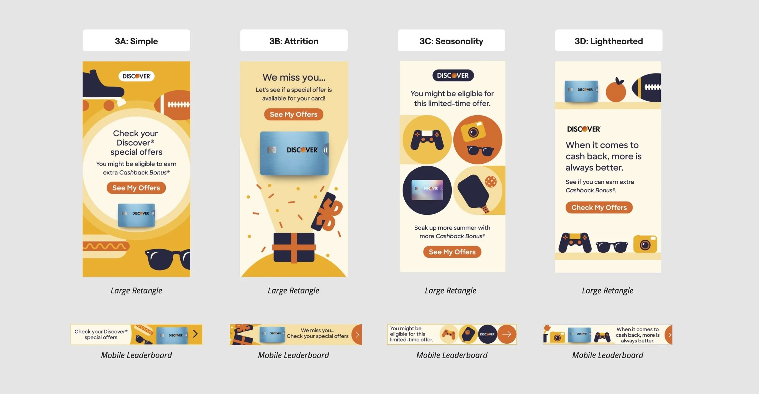 For Q3 2025, Discover launched a multi-channel campaign to drive enrollment in targeted Cashback Bonus (CBB) offers. I was responsible for developing the illustrated creative direction, creating a visual system that replaced traditional lifestyle imagery with clean, engaging illustration.