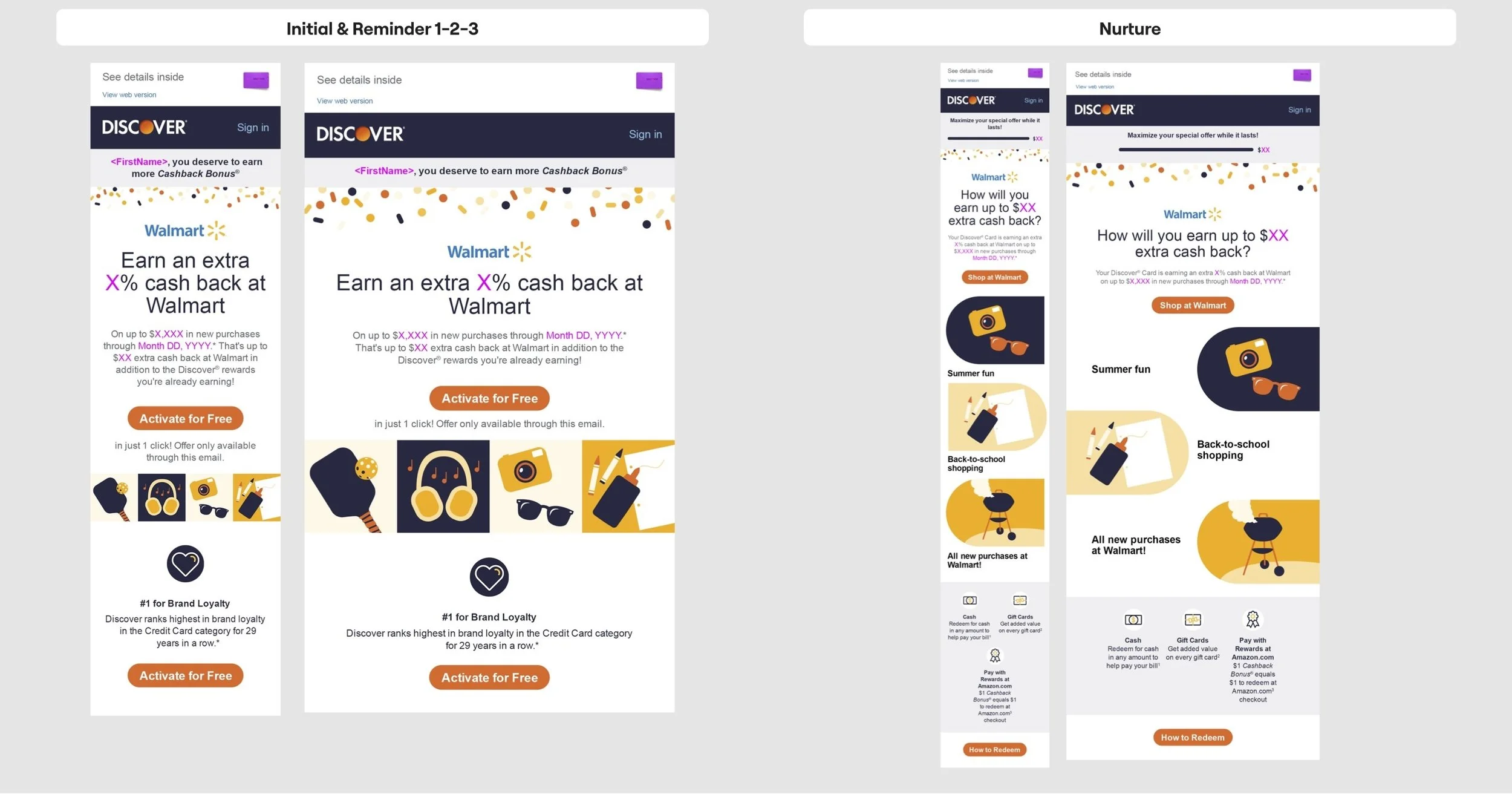 Designed an illustration-forward creative for the Walmart-specific Cashback Bonus offer, aiming to re-engage cardmembers across multiple segments with a seasonal, visually distinct alternative to the standard photo-based emails.