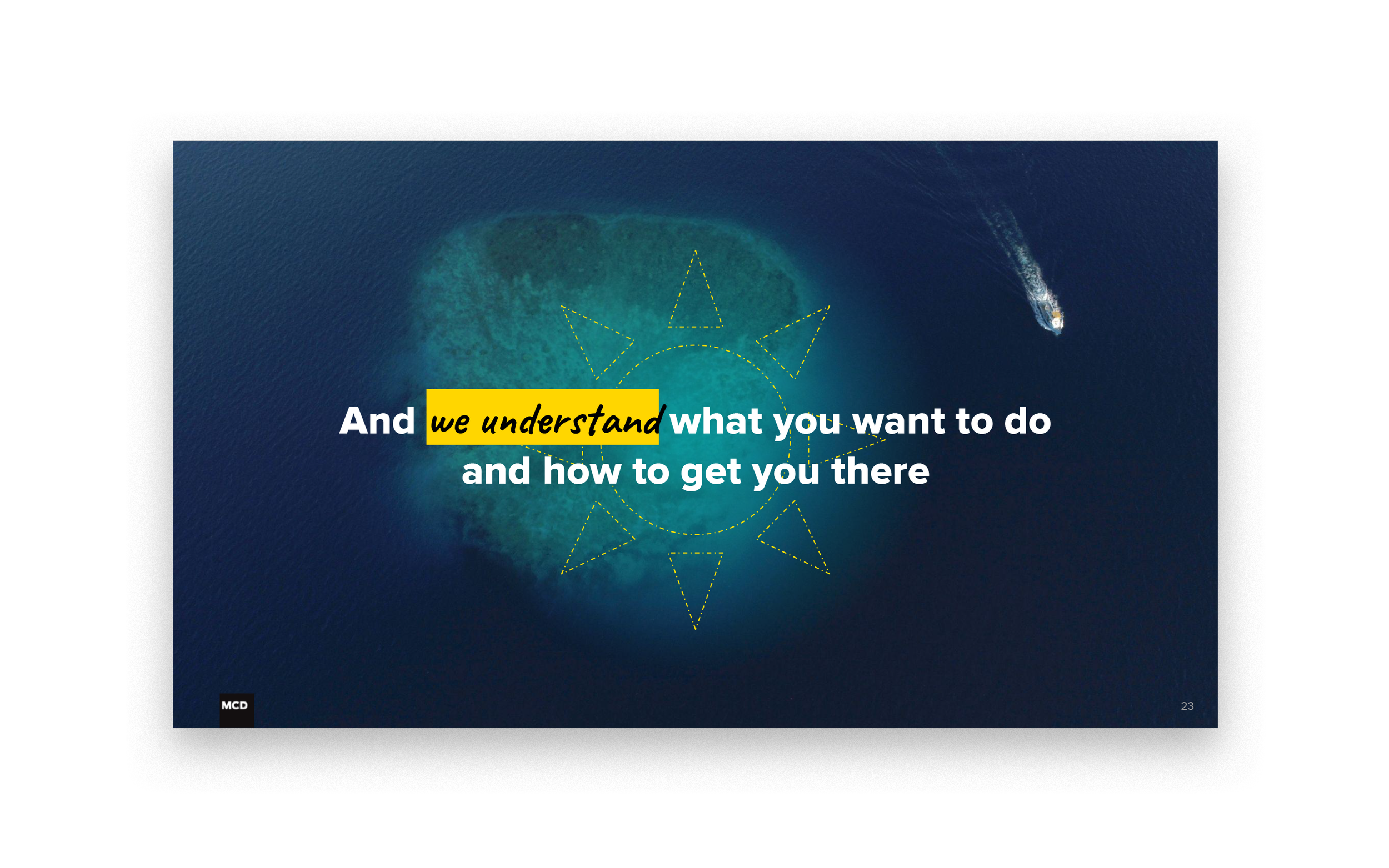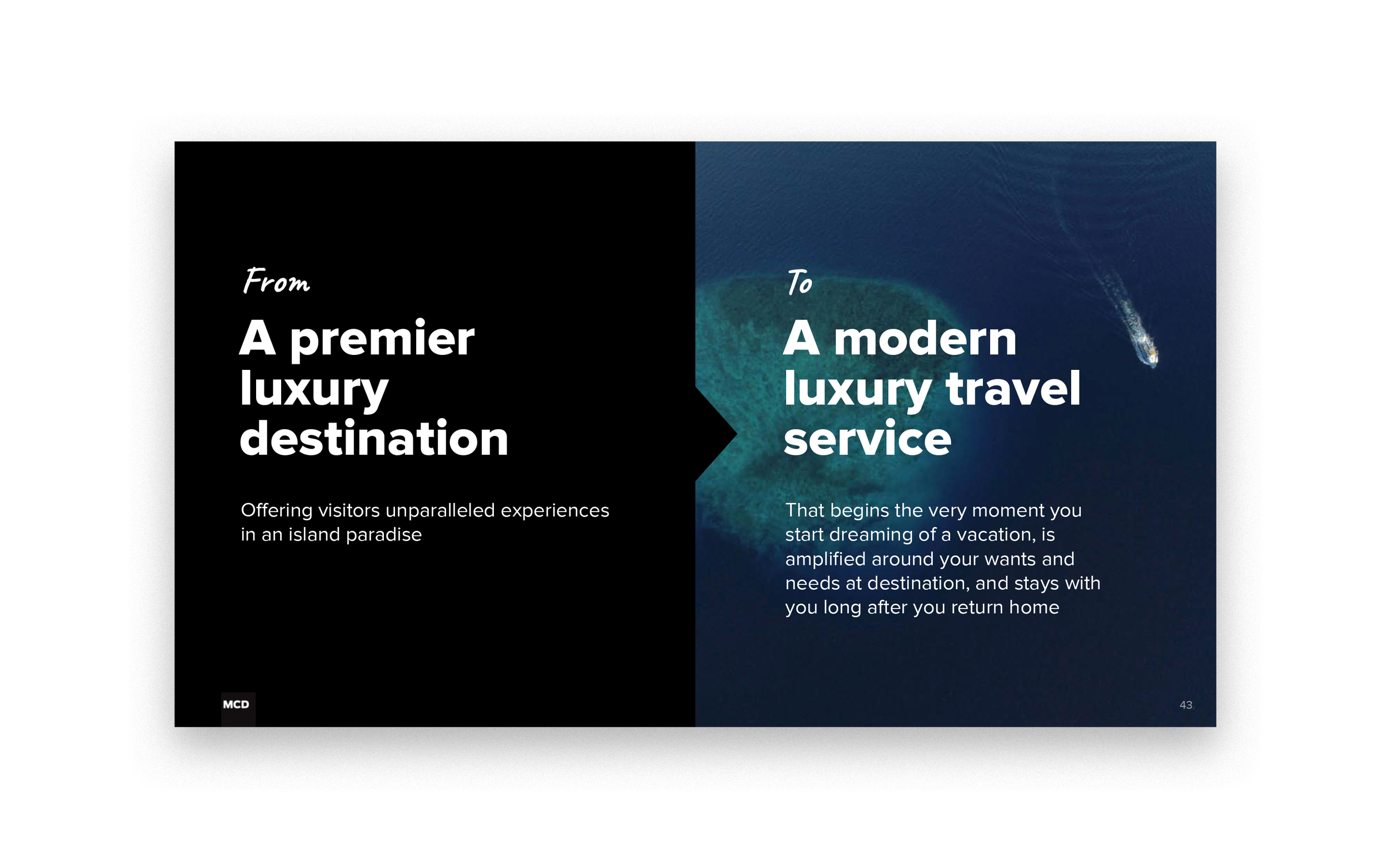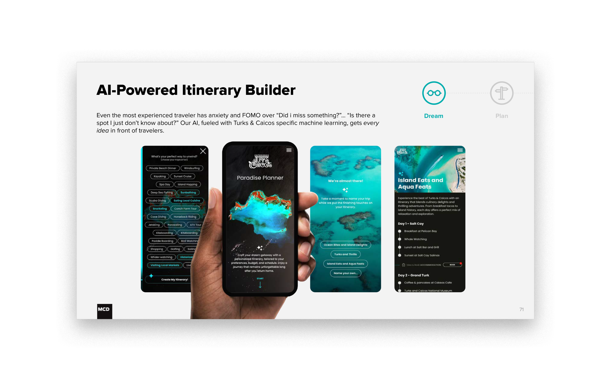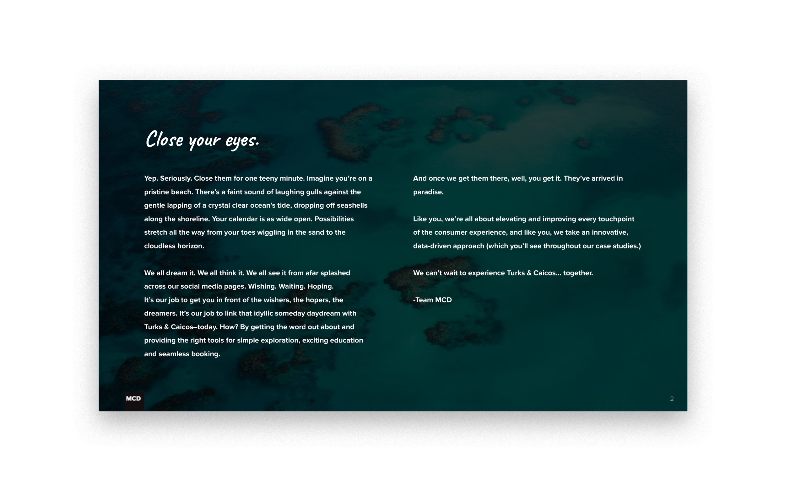 This ambitious pitch deck was developed for MCD Partner’s response to Experience Turks and Caicos’ request for proposal.