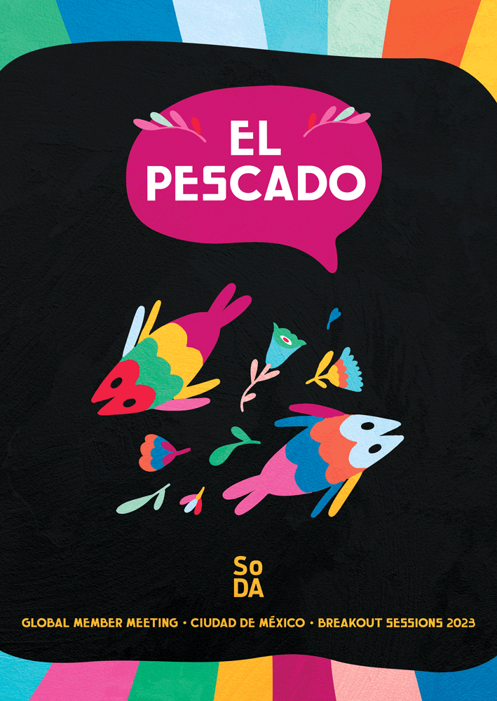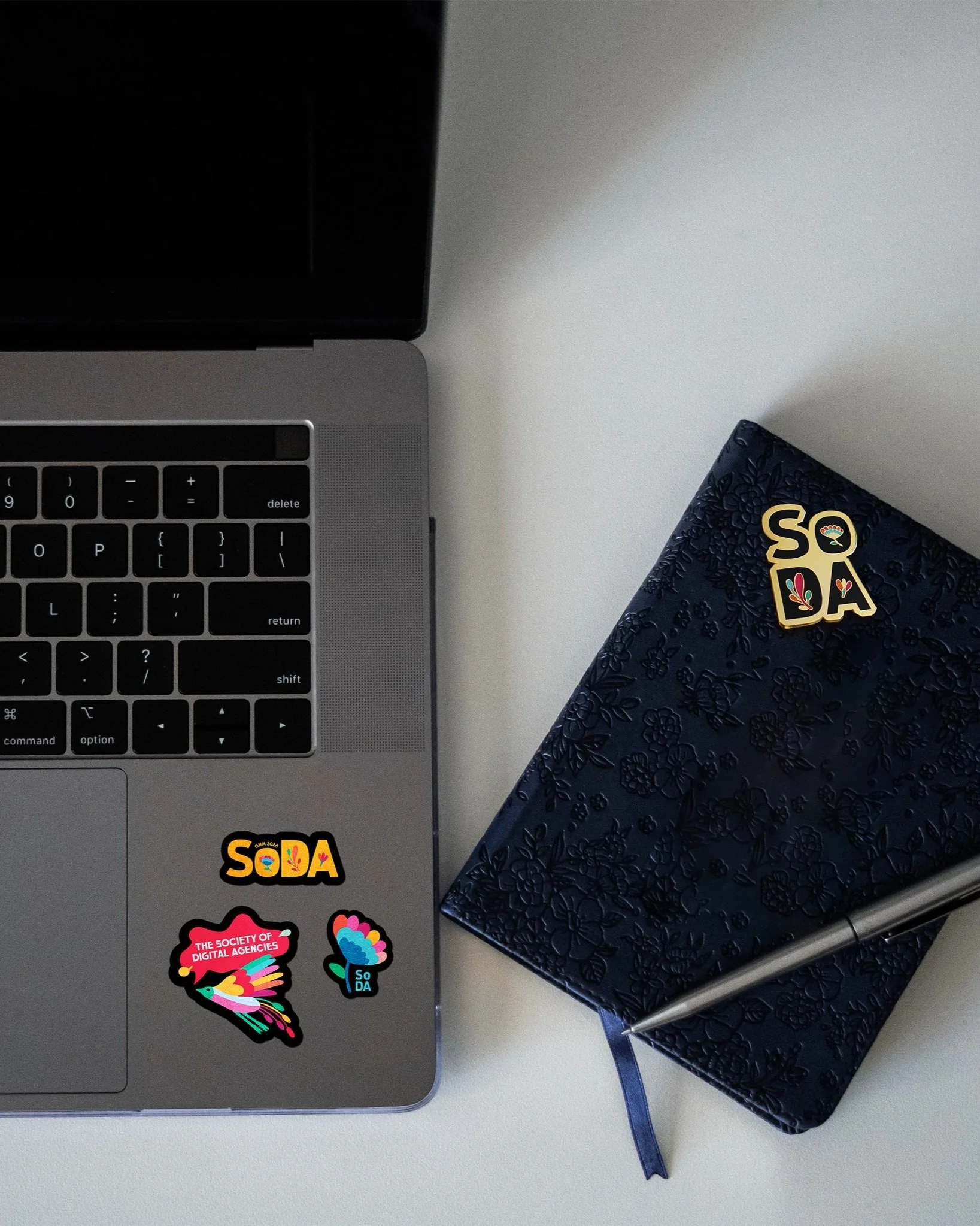 For SoDA’s yearly summit, I led the full event branding and visual identity. Inspired by the vibrant, surreal world of Mexican Alebrijes, I created a bold design system that extended across all event touchpoints—from stage banners and signage to program guides, projection slides, and the event website. I also designed a suite of playful branded swag, including custom enamel pins, socks, and stickers for attendee gift bags.