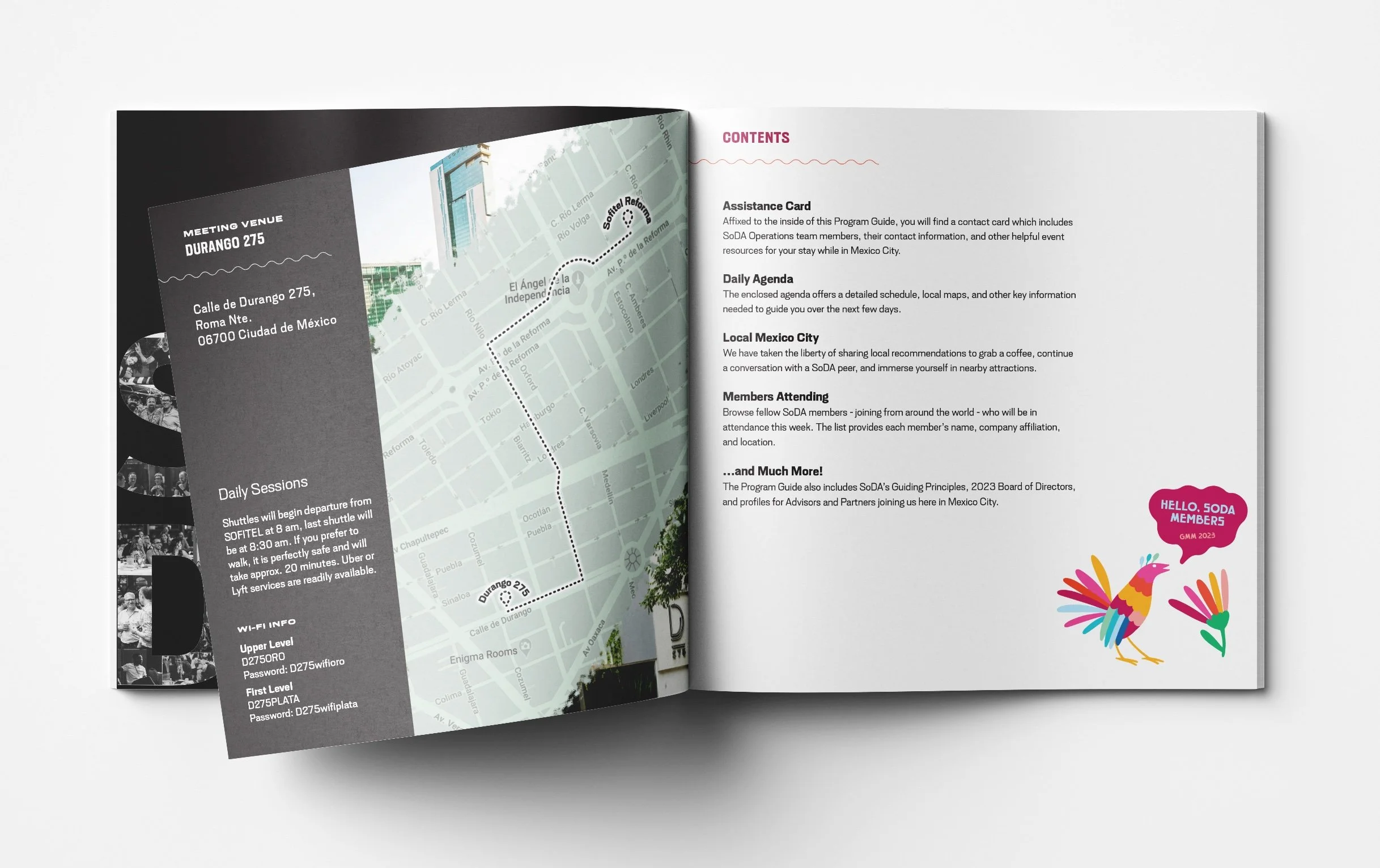 The program guide was the go-to resource for attendees throughout the event. It included everything from the daily agenda and dinner locations to the full attendee list and sponsor info—all wrapped in a bold, colorful layout.